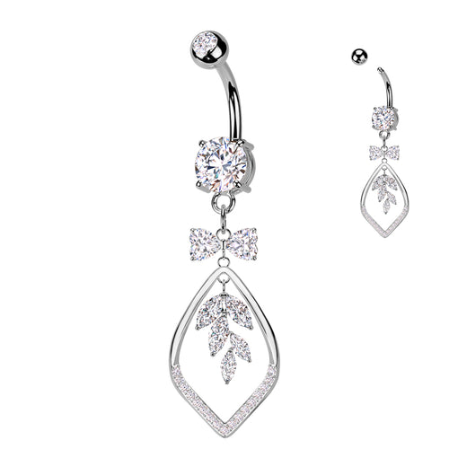 316L Surgical Steel White CZ Bow & Vine Dangle Belly Ring