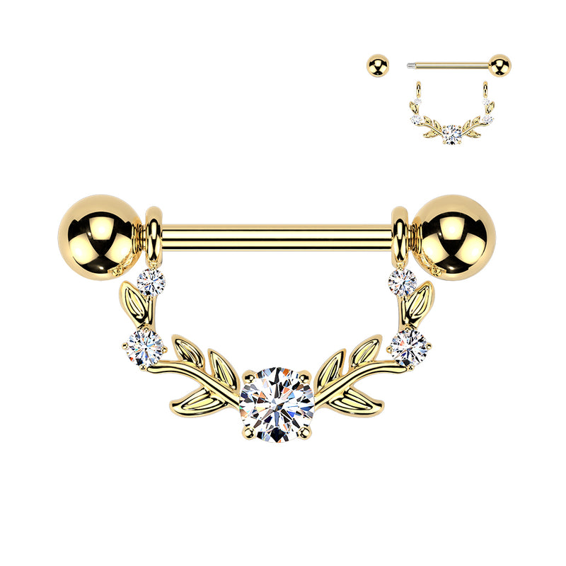 316L Surgical Steel Gold PVD White CZ Vine Shield Nipple Ring Straight Barbell