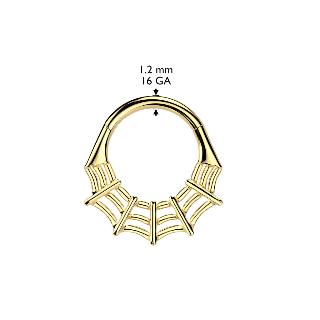 Ideal for septum piercings, this Implant Grade Titanium Spider Web Hinged Clicker Hoop features a flared spider web design. Perfect for spooky season or every day wear!