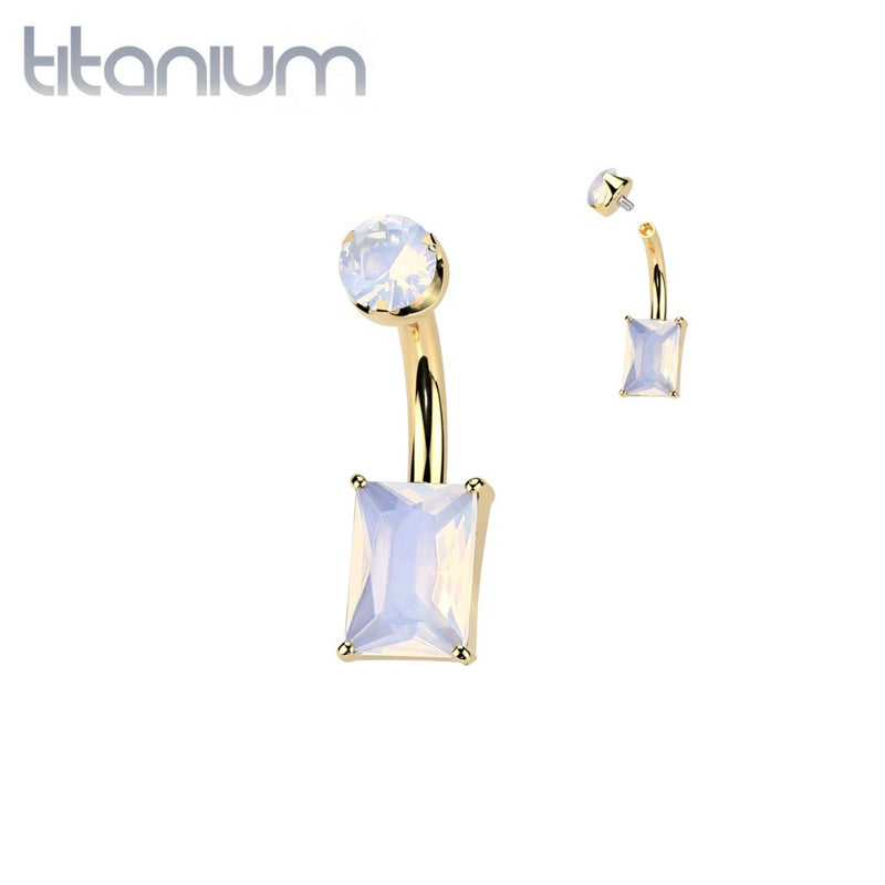 Implant Grade Titanium Gold PVD Rose Quartz Stone Rectangle Internally Threaded Belly Ring