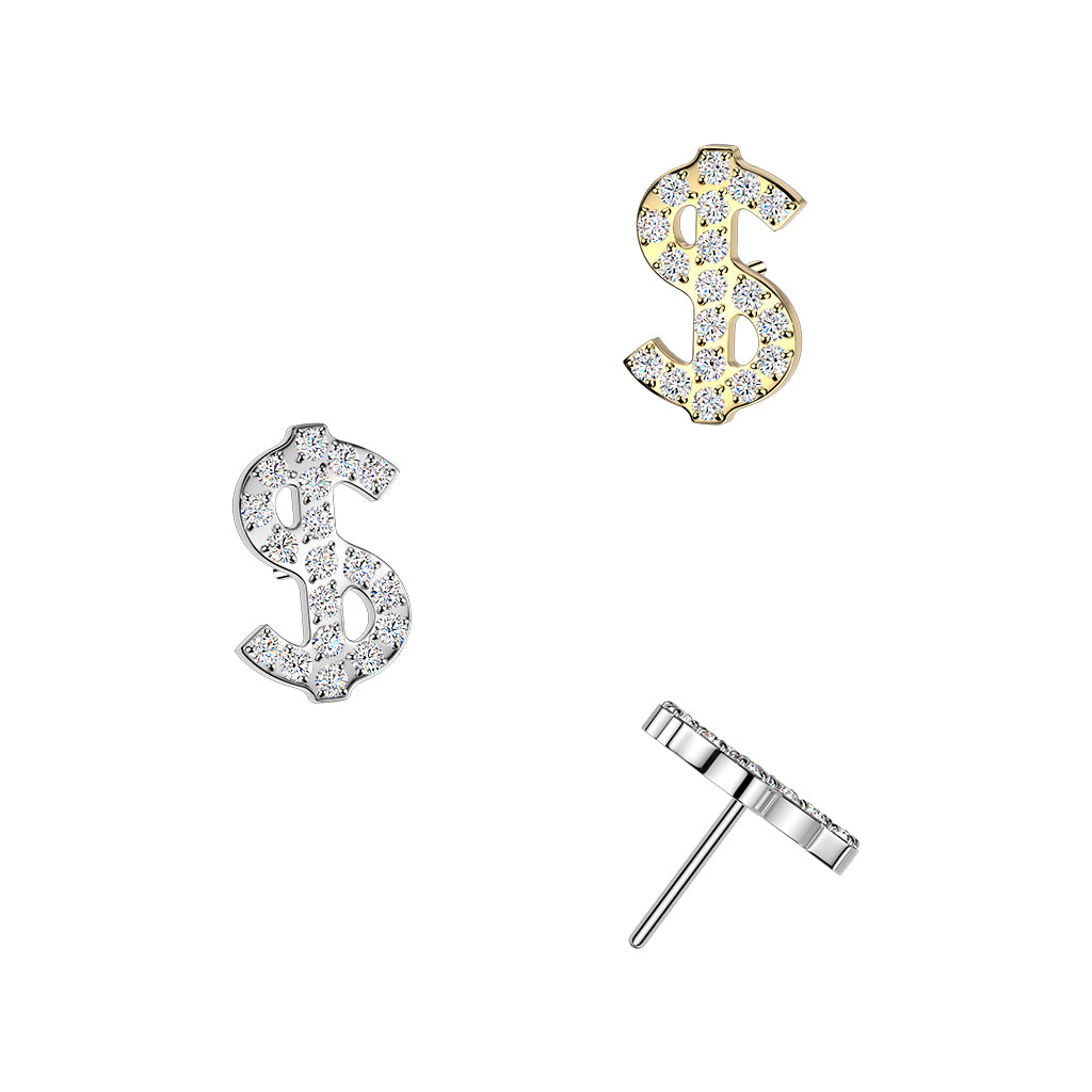 Implant Grade Titanium Gold PVD White CZ Money Dollar Sign Threadless Labret With Flat Back