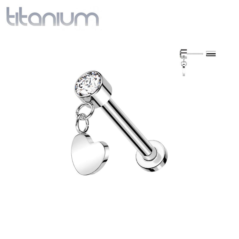 This Threadless Implant Grade Titanium Labret is perfect for any piercing. It has a Threadless White Cubic Zirconia cz heart dangle top. It also comes in a variety of bar lengths. These are easy to put in and secure so it doesn't fall out.