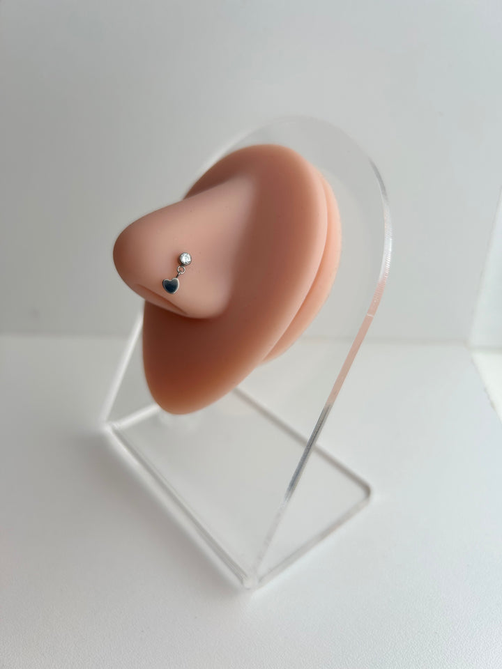 Implant Grade Titanium Threadless Push In Nose Ring White CZ Heart Dangle With Flat Back