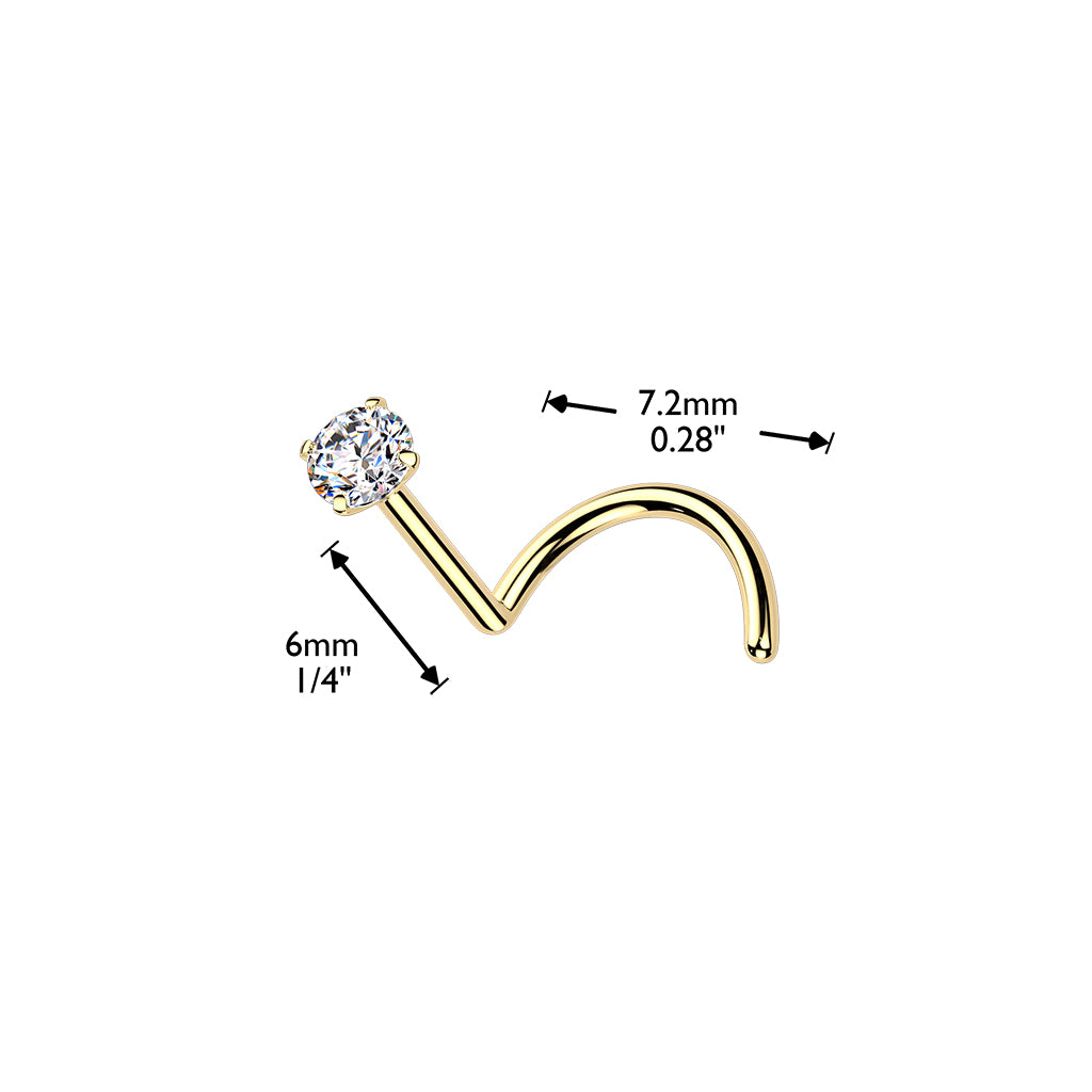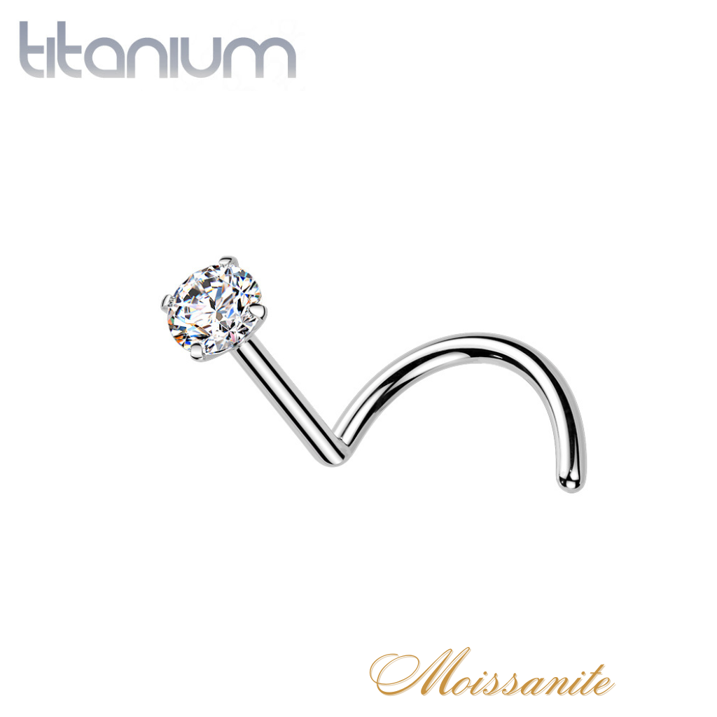 This White CZ Titanium Corkscrew Nose Ring showcases a white moissanite gem, offering a premium alternative to traditional stones. Our luxury style, moissanite provides greater durability and we exclusively use D color stones, the highest grade on the color scale, delivering a brilliant, colorless sparkle that closely mirrors the finest diamonds. Each gem boasts VVS clarity, indicating they are nearly flawless to the naked eye.