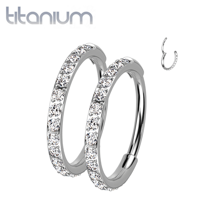 Pair Of Implant Grade Titanium White CZ Pave Dainty Hinged Hoop Earrings